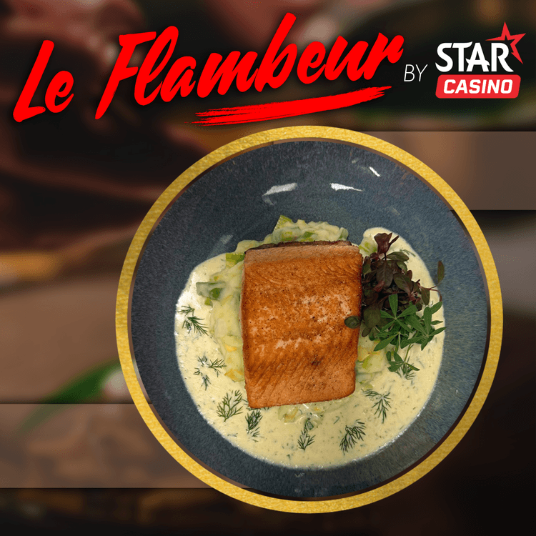 Découvrez notre plat culinaire de la semaine au restaurant Le Flambeur : Filet de saumon, sauce aneth, poté de poirreaux! Un plat riche en saveurs, tendrement préparé pour vous à seulement 21€ ou 34€ avec 20€ de crédits de jeux. Profitez de cette offre du 16 décembre au 21 décembre !